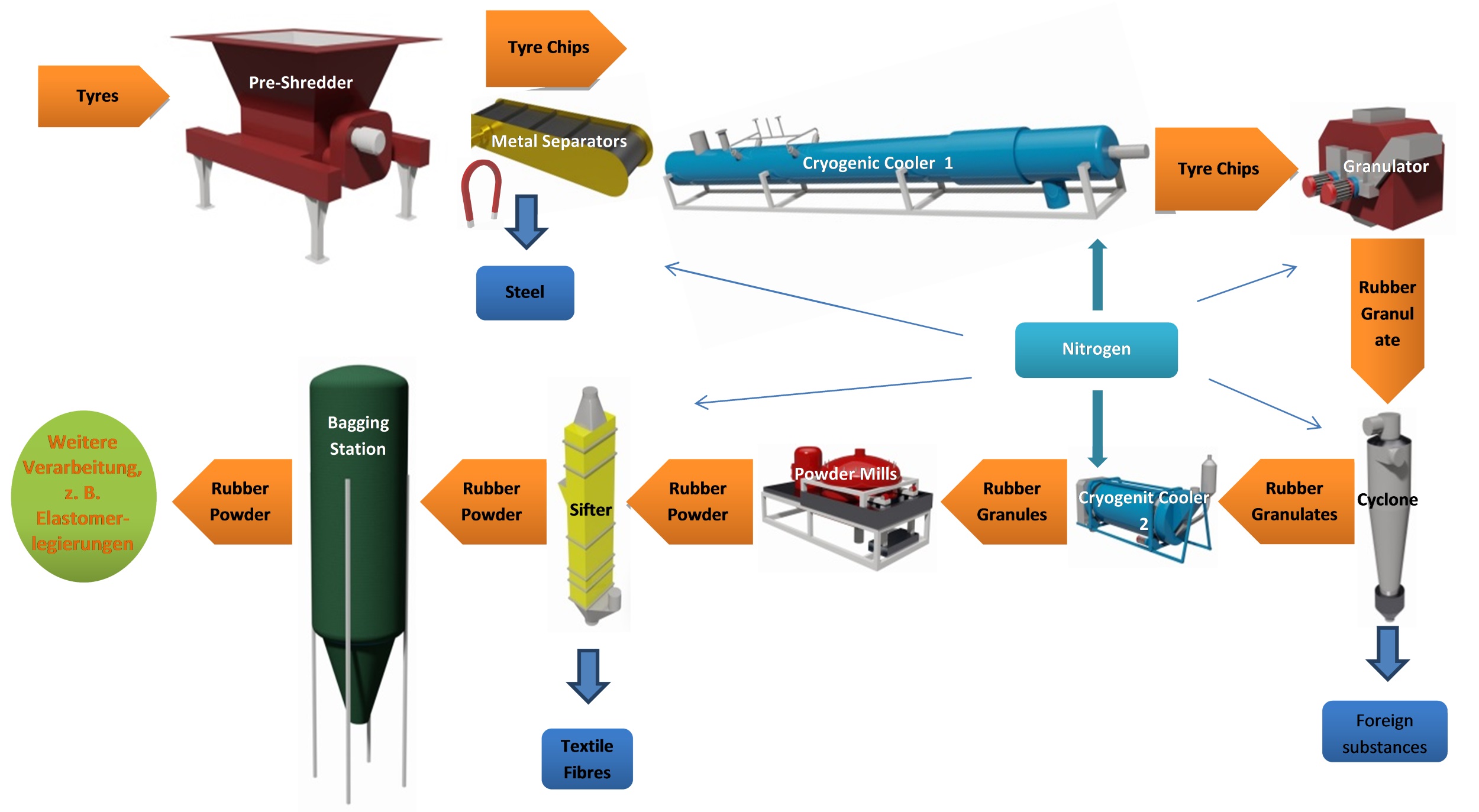 In a continuous process with very deep temperatures (up to -195 °C), the INTEC RC 500/05 processes end-of life-tyres by utilising liquid nitrogen as cooling agent. Without modification or additional equipment, also numerous other rubber residues can be utilised. Numerous technical innovations, the enclosed fully automatic system and the patented technology ensure highest effectivity and productivity.