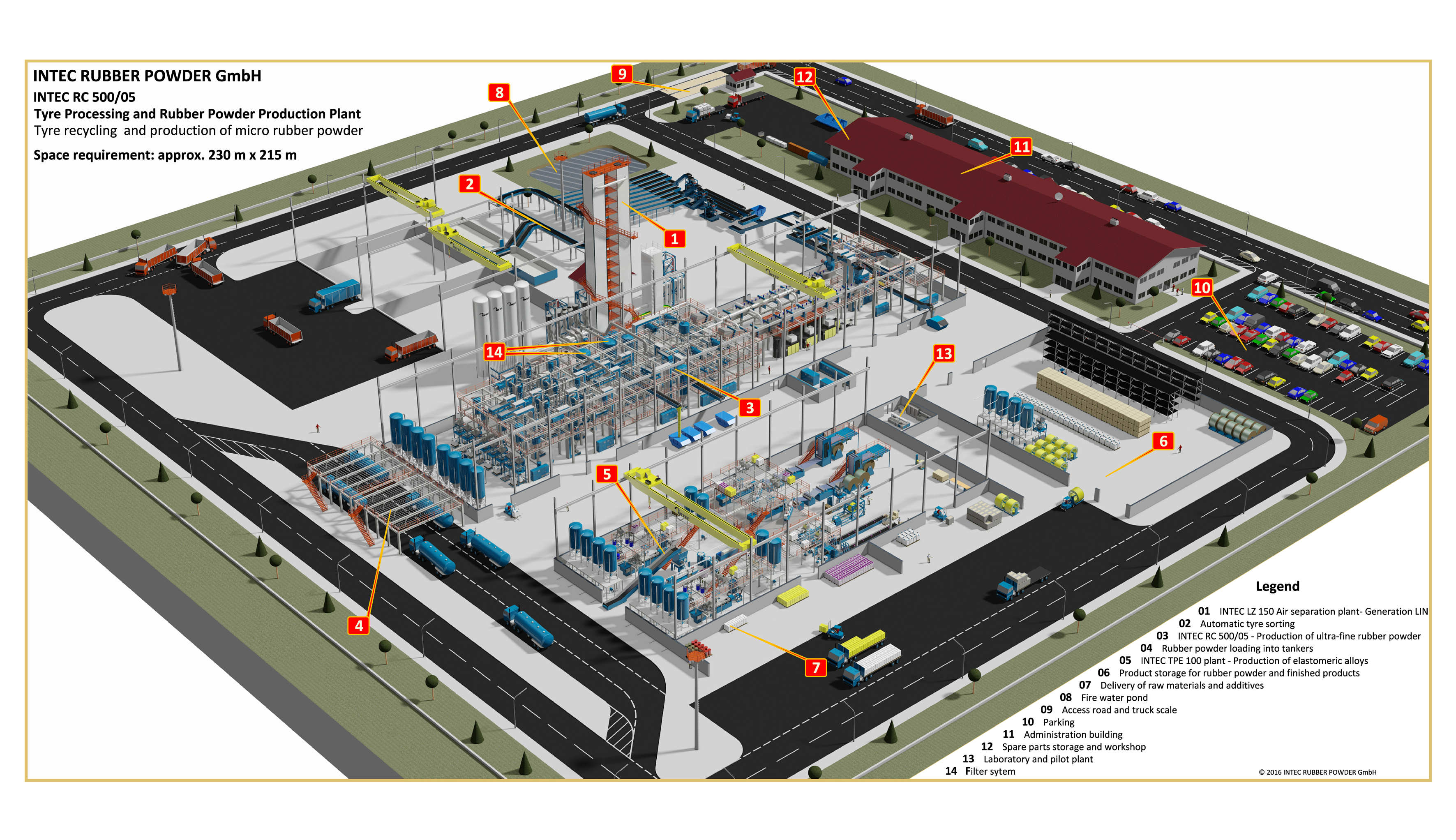 The INTEC RC 500/05 Tyre Recycling and Rubber Powder Processing System was developed for the material recovery of end-of-life tyres and rubber residues as an alternative to the disadvantageous incineration. For INTEC, these residues are not only an ecologic challenge but also primarily a valuable resource.